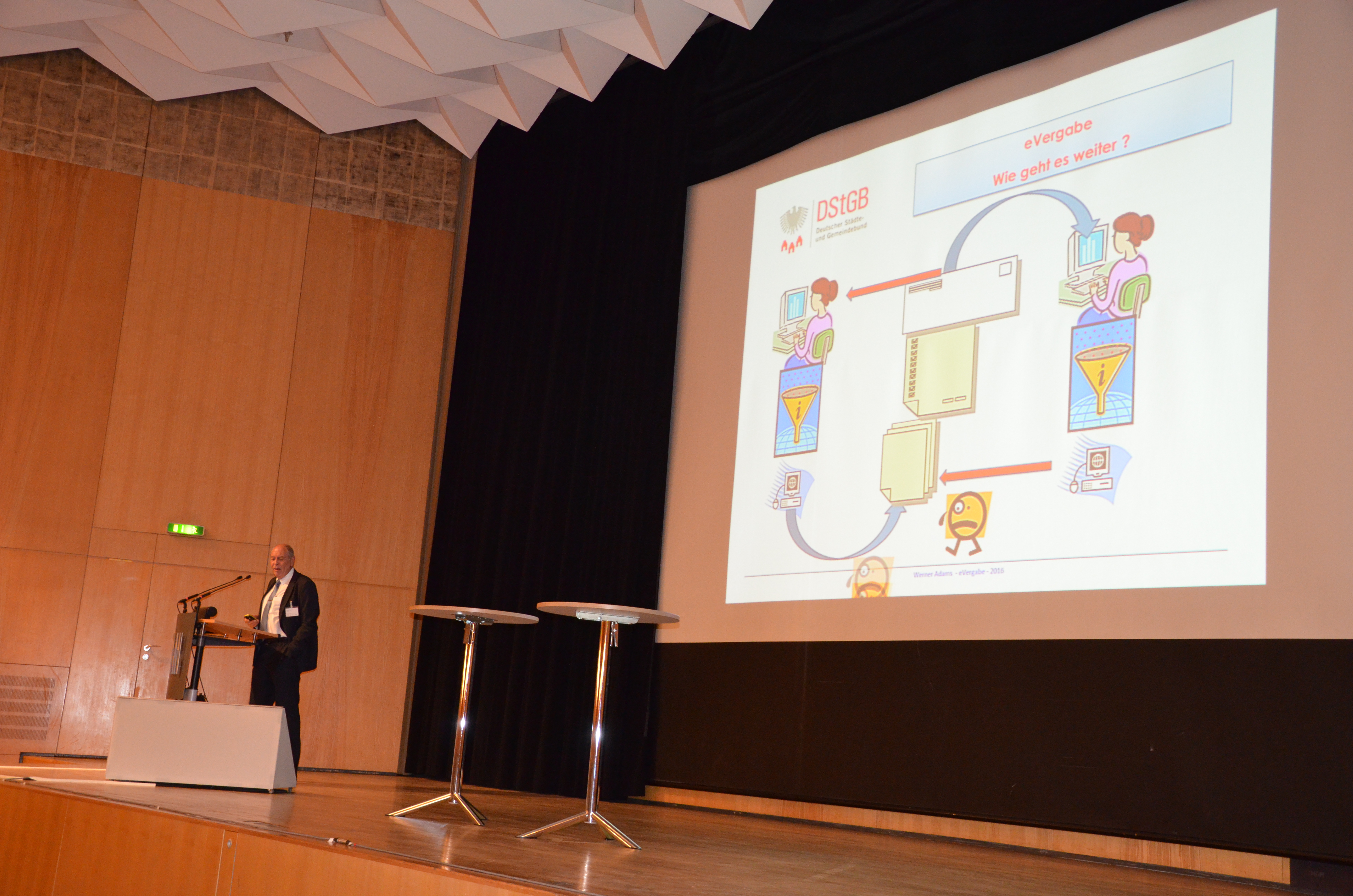 Vergaberechtsexperte Werner Adams warb auf der Tagung für die eVergabe. Das Ausdrucken und Versenden von am Computer erstellten Dokumenten sei ein großer, ein unnötiger Aufwand. Mit Papierverfahren würden nicht nur die Vergabestellen belastet. Sondern auch die bietenden Unternehmen. Auf EU-Ebene gelte bereits, dass Bekanntmachungen für Vergabeverfahren nur noch elektronisch an das europäische Amt für Veröffentlichungen übermittelt werden können, sagte Adams, leitender Stadtverwaltungsdirektor im Ruhestand. Die elektronische Vergabe führe zu einer Verbesserung der Vergabeprozesse. Sie schaffe nicht nur „ein bisher nicht mögliches Maß an Transparenz“, sondern beschleunige die Vergaben und senke die Kosten für die Vergabe deutlich.