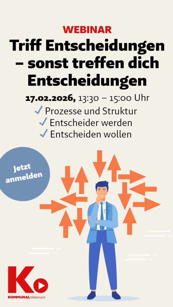 Kommunen stehen heute vor der Herausforderung, immer komplexere Aufgaben zu bewältigen – doch oft scheitern Projekte nicht am Geld, sondern am Zögern. Im 90-minütigen Webinar zeigt Christian Burgart, warum Entscheidungsfreude zur zentralen Zukunftskompetenz in Verwaltung und Politik wird. Anhand konkreter Beispiele aus der Praxis wird deutlich, wie mangelnde Entscheidungsprozesse Vorhaben ausbremsen, Verantwortung verwischen und Chancen vergeben – und wie es gelingt, diesen Kreislauf zu durchbrechen. Ein Webinar für alle, die ihre Kommune vom Verwalten ins Gestalten bringen wollen – mit Mut, Klarheit und Haltung.