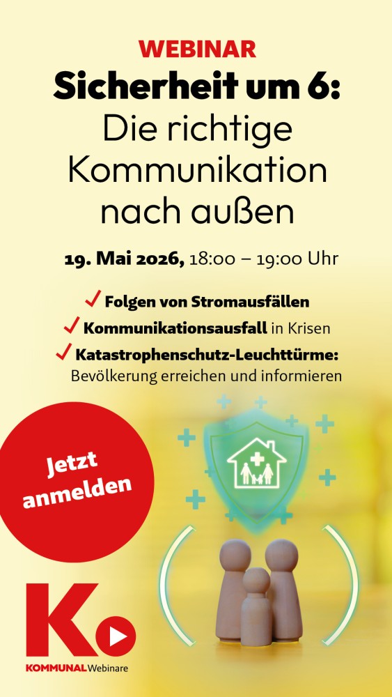 Wenn der Strom ausfällt, steht nicht nur die Infrastruktur still — auch die Kommunikation wird zur Herausforderung. Wie können Behörden Bürgerinnen und Bürger in einer solchen Lage noch erreichen? Welche Rolle spielen Anlaufstellen und Katastrophenschutz-Leuchttürme? Antworten darauf gibt das Webinar „Sicherheit um 6“ am 19. Mai 2026 um 18:00 Uhr.