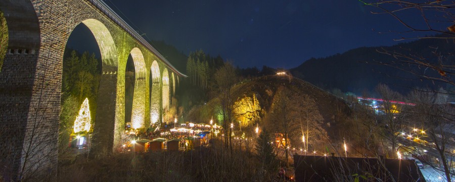 Die Ravennaschlucht im Südschwarzwald mit ihren Wasserfällen und dem Viadukt ist ein echter Hingucker. Am schönsten ist sie jedoch zu Weihnachten, wenn unter den Viaduktbögen warm erleuchtete Buden mit dem Duft nach Glühwein und gebrannten Mandeln auf dem Weihnachtsmarkt in der Ravennaschlucht locken. Kunsthandwerk und regionale Produkte unterscheiden den Weihnachtsmarkt von „Standardmärkten“.